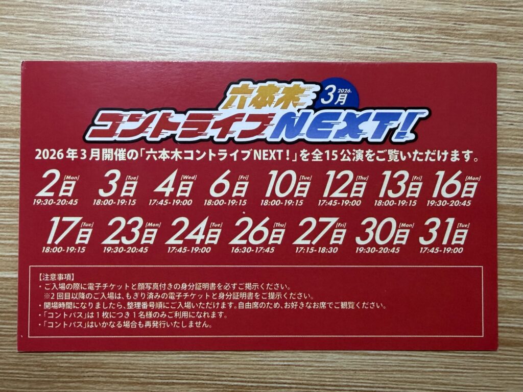 コントパスの対象となるのは、「六本木コントライブNEXT!」という公演です。